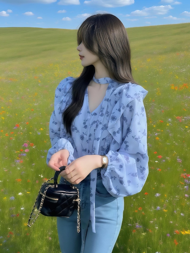 フレンチVネック花柄シフォンシャツ、秋フリルホルターネックリボントップ、ハイエンドでエレガントなシャツ