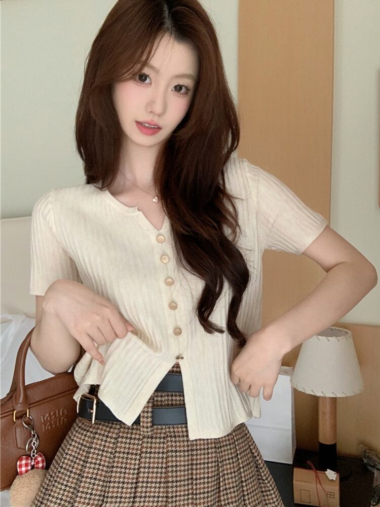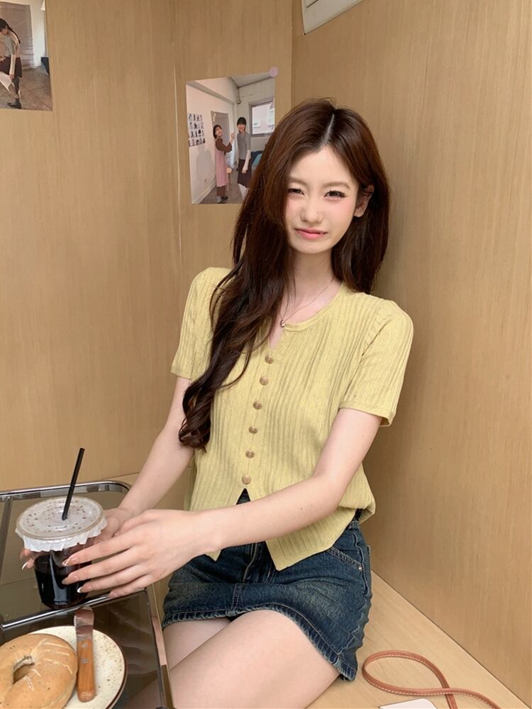 # ニットアイスシルク半袖 T シャツ女性の夏の新しいデザインニッチシックなボトリングトップ!