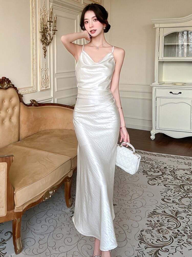 女性のためのファッションアイテム、フレンチスイングカラーサスペンダーサテンドレスが新登場しました!この洗練されたデザインは、特別な日を華やかに演出するための理想的なアイテムです。
