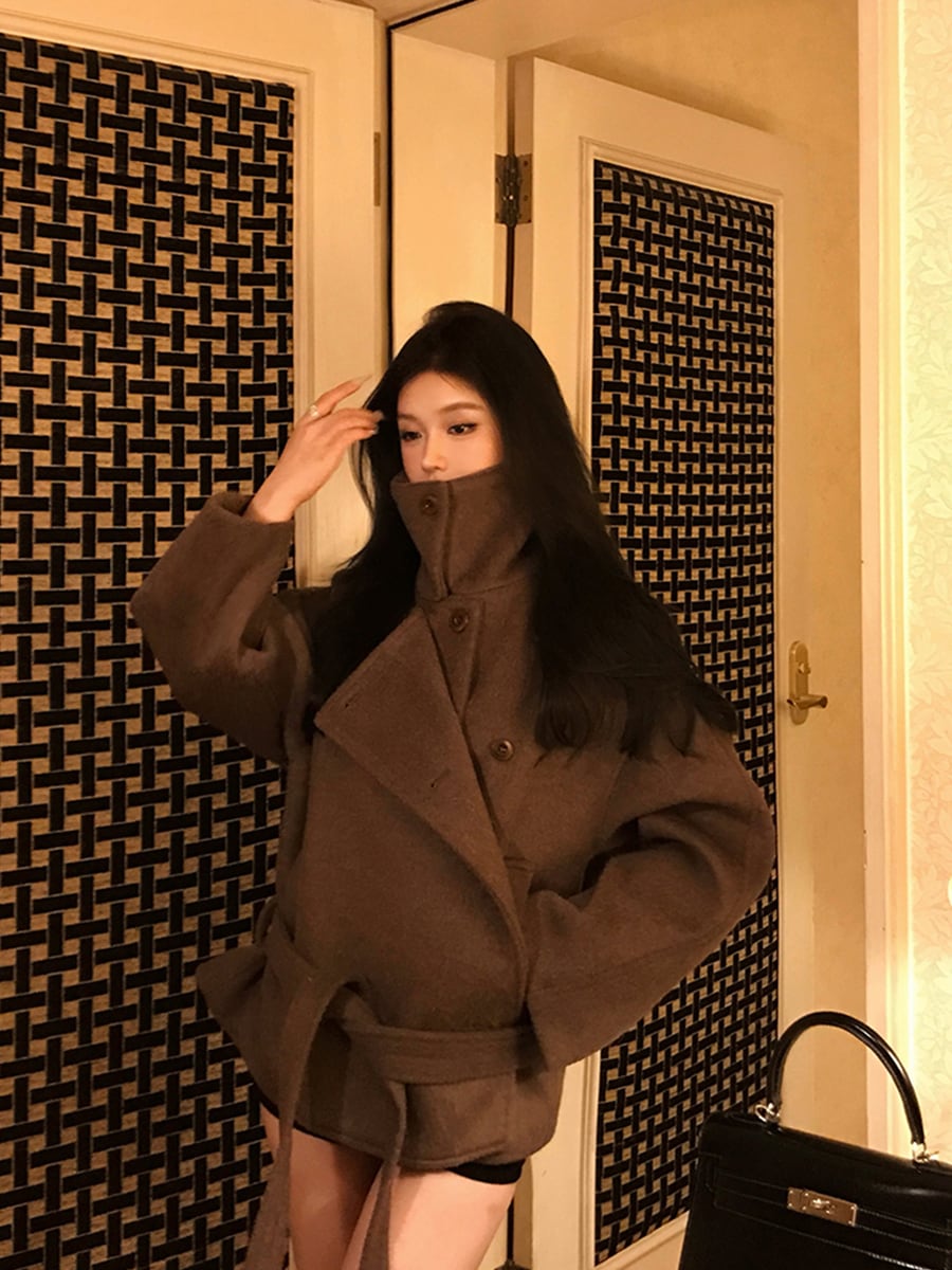 # スタンドカラー シルエットレースアップカシミヤウールコート韓国スタイル 洗練された魅力を引き立てる特別な一着!