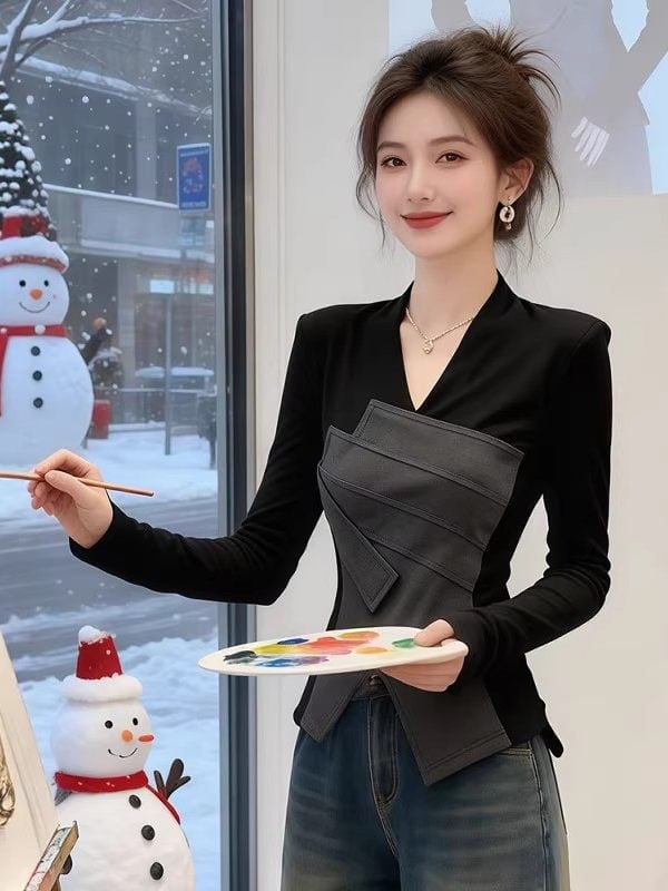# ファッショナブルなツーピース対照的 V ネック長袖 T シャツ 特別な一着!