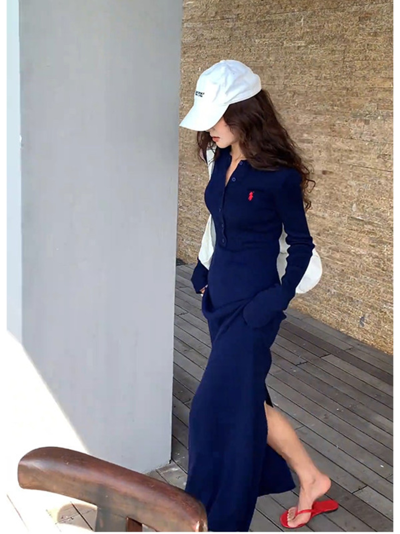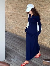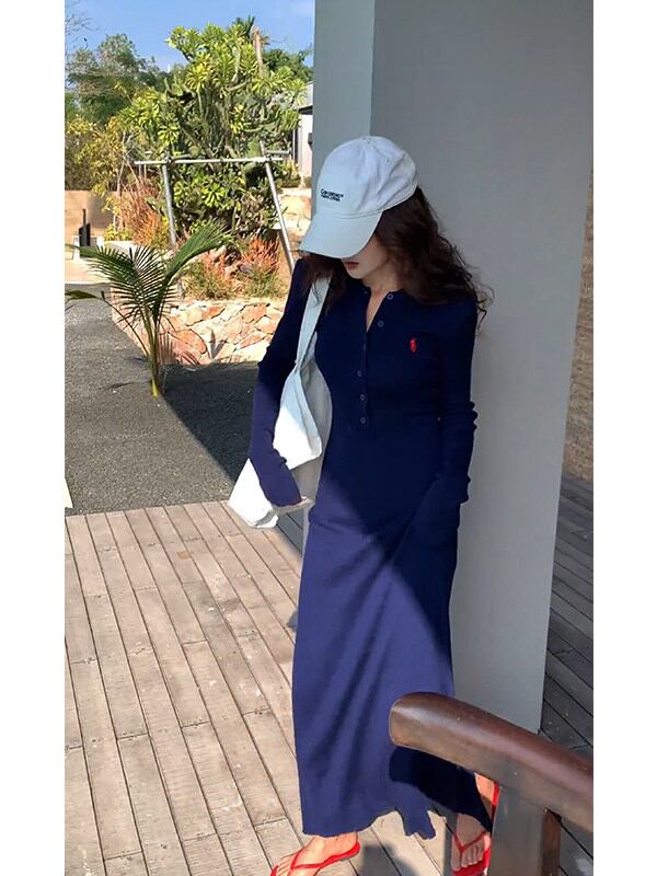 # 2026年春 海辺での休暇 ウエストを絞ったリアスリット ポロカラー ネイビーブルー ニットドレス 特別な一着!