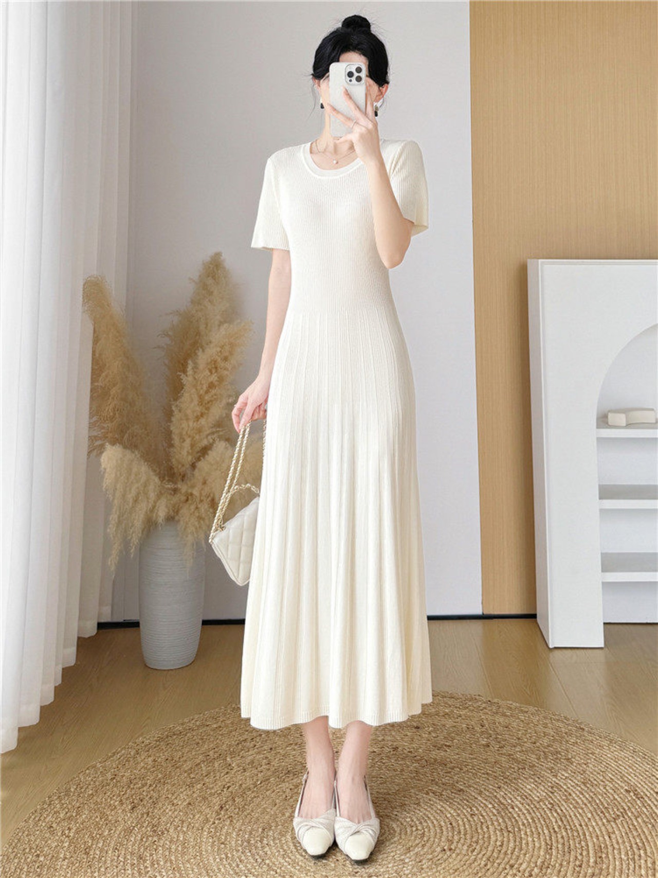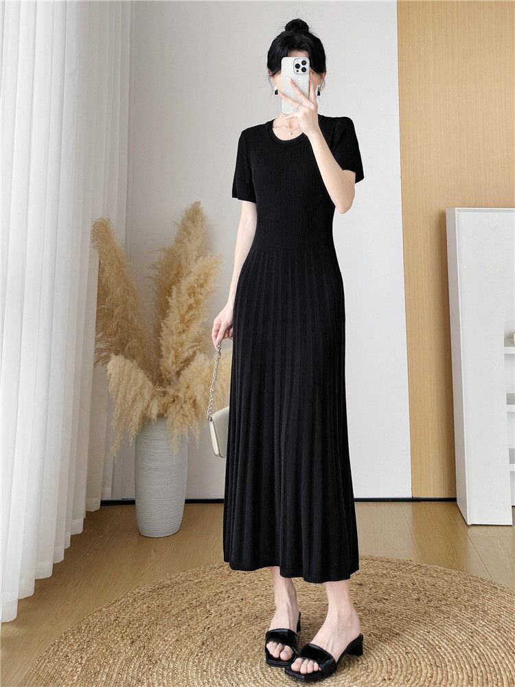 フレンチブラック半袖アイスシルクニットドレス 夏のレトロウエスト Aラインプリーツボトムロングスカート