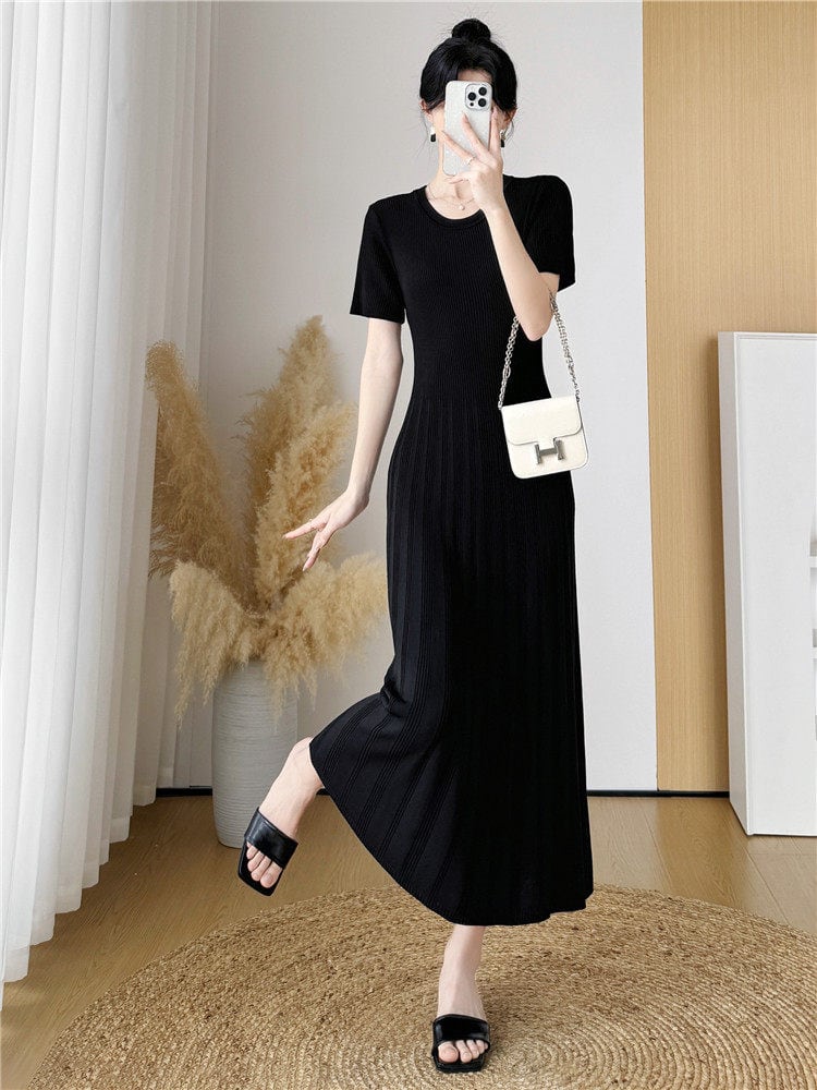 # 女性用フレンチブラック半袖アイスシルクニットドレス 夏のレトロウエスト痩身Aラインプリーツボトムロングスカート 特別な一着!